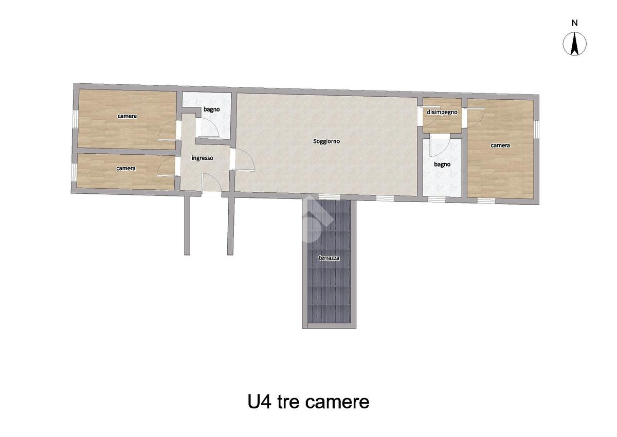 L'abitazione è composta da un ingresso, un ampio soggiorno affacciato su uno spazioso terrazzo loggiato e cucina a vista, tre camere e due bagni.