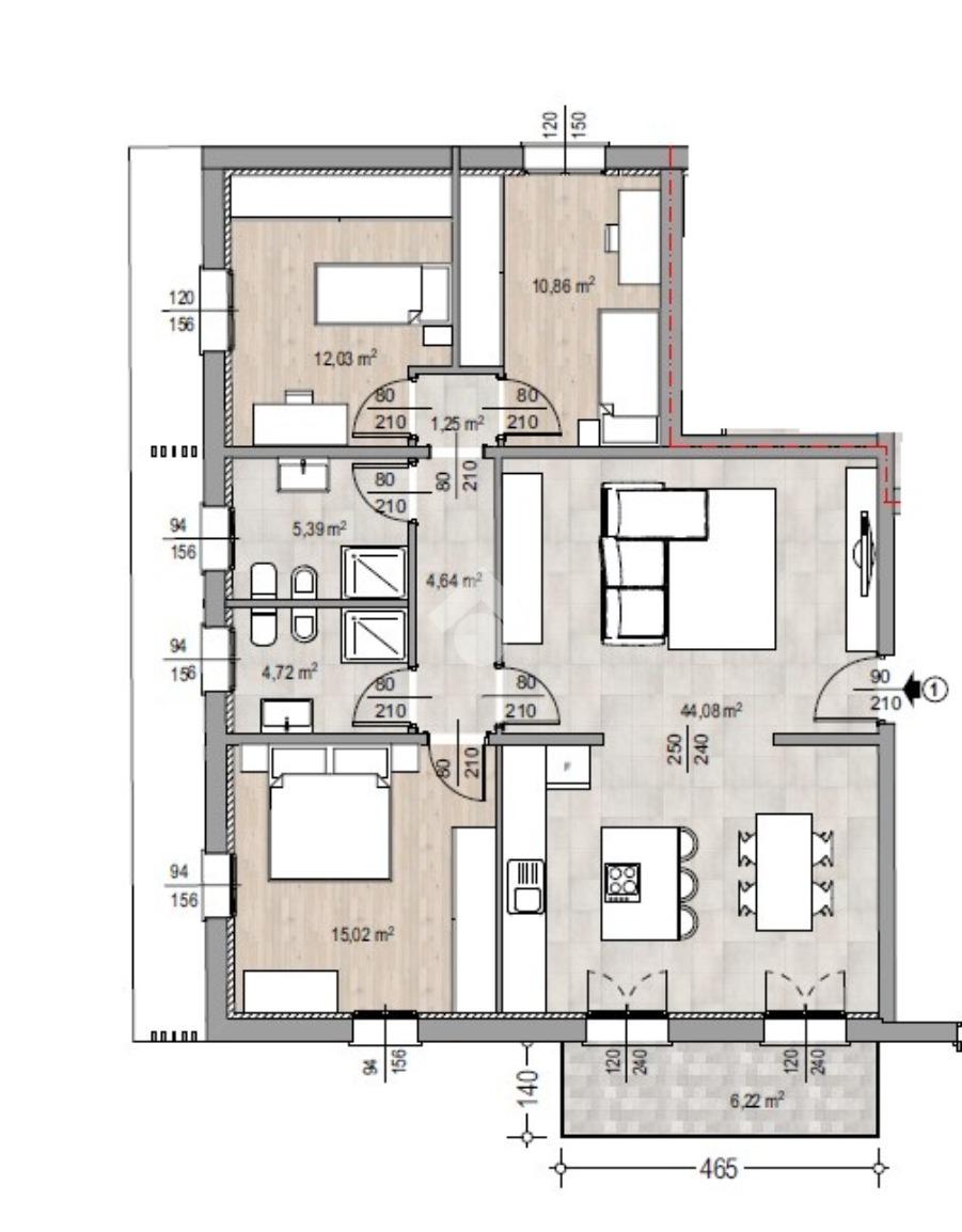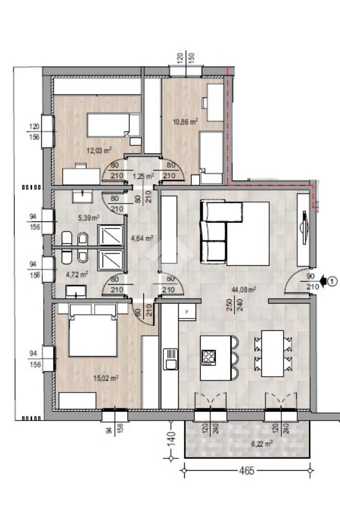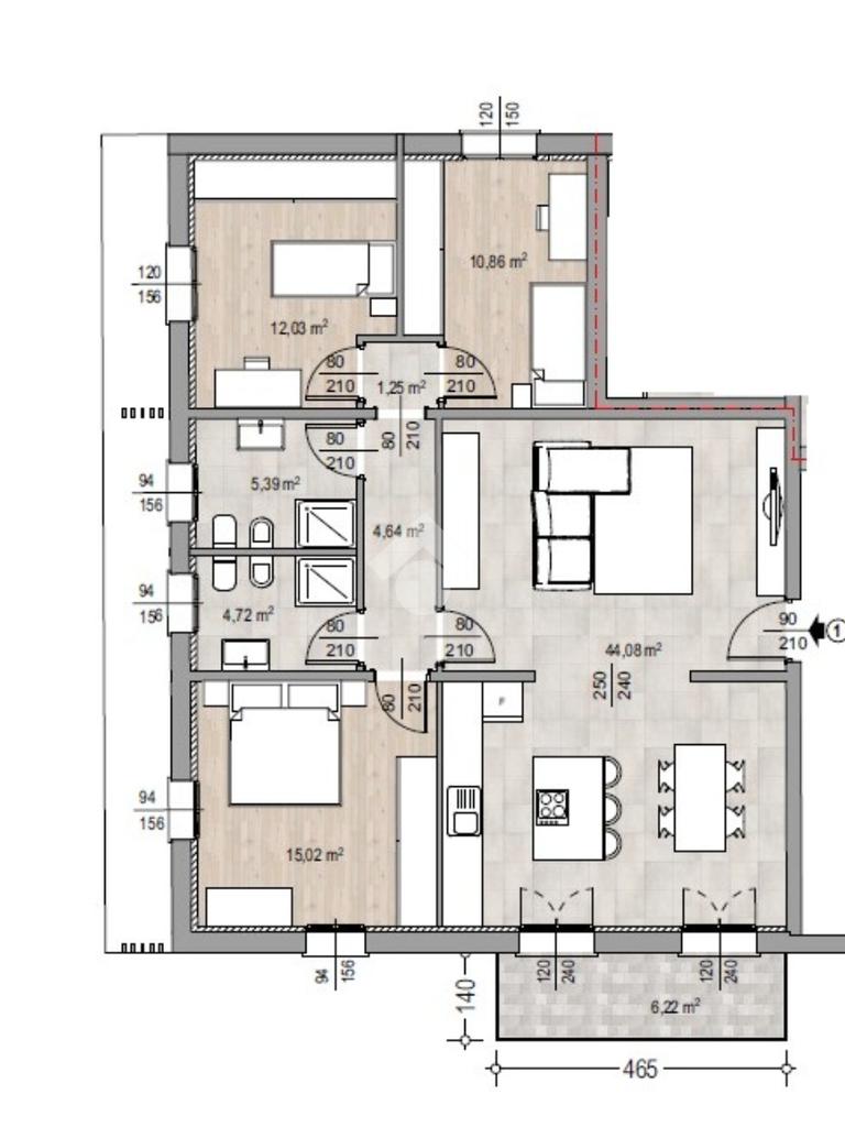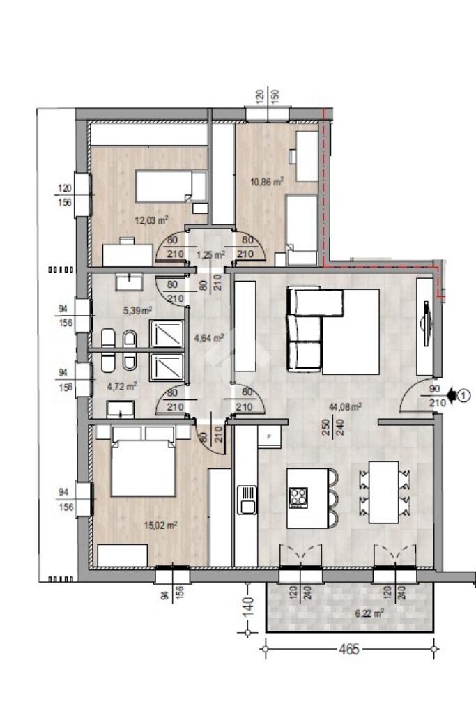 L'immobile di ampiametratura è composto da ingresso in soggiorno con cucina a vista e balcone, tre camere da letto, due bagni.
