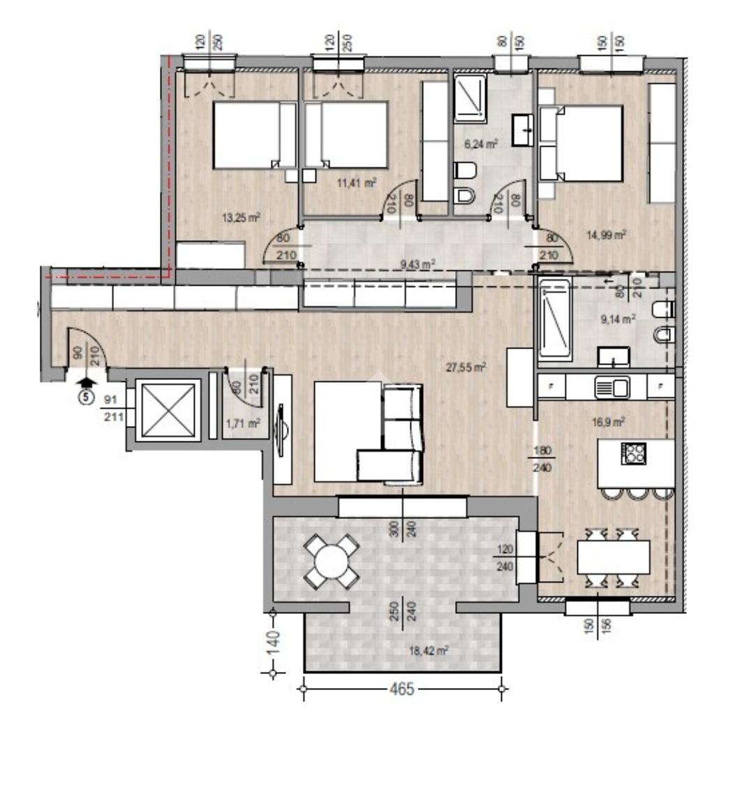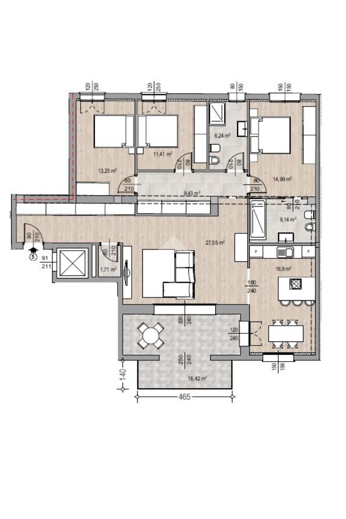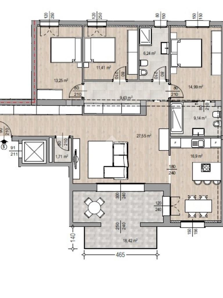 L'immobile di ampia metratura è composto da un ampio ingresso, soggiorno con cucina abitabile separata con terrazzo, tre camere da letto matrimoniali, due bagni e ripostiglio.