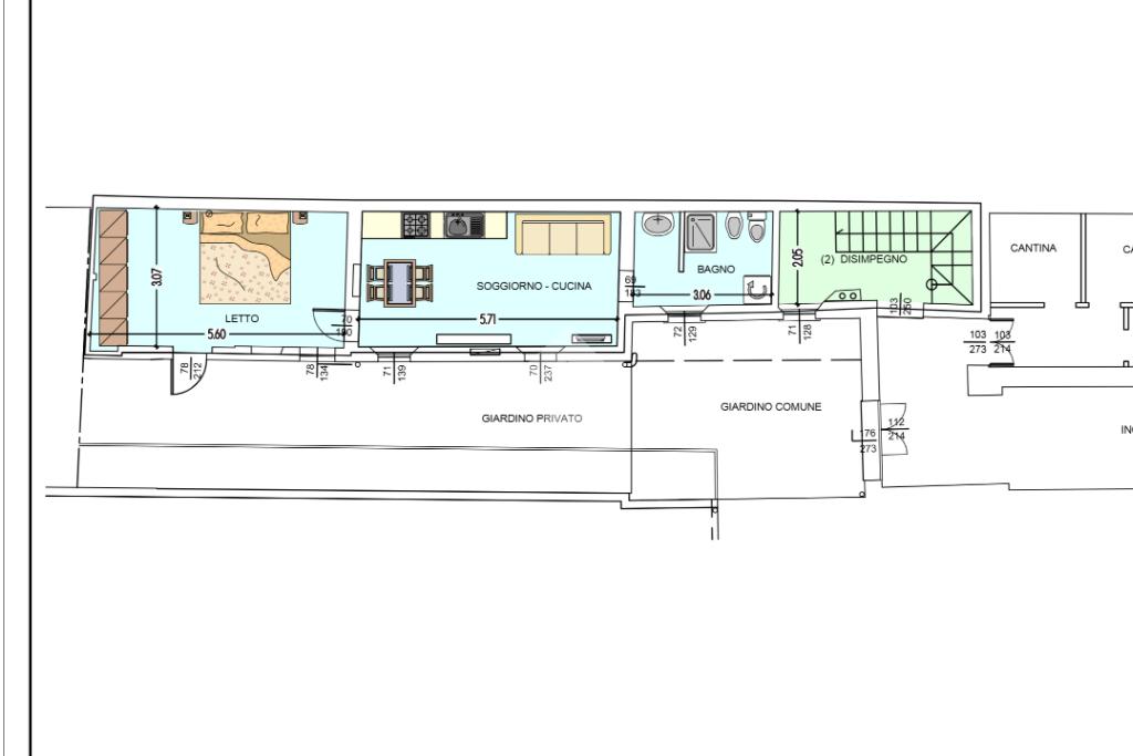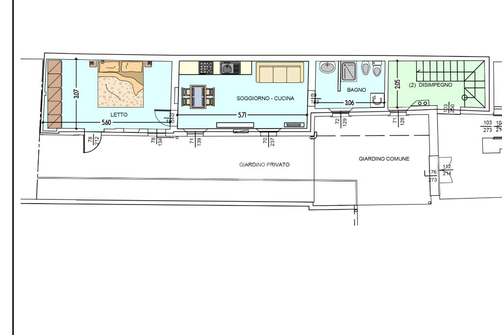 Ingresso in soggiorno con cucina a vista, ampia camera matrimoniale, entrambi con accesso diretto al giardino, e bagno con finestra.