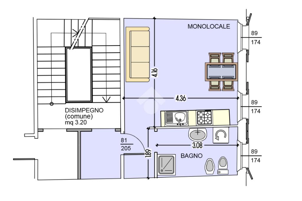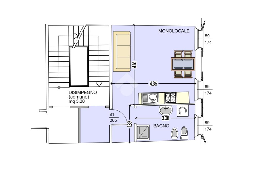 L'appartamento è composto da ingresso, disimpegno, ambiente principale living/zona notte, bagno con finestra.