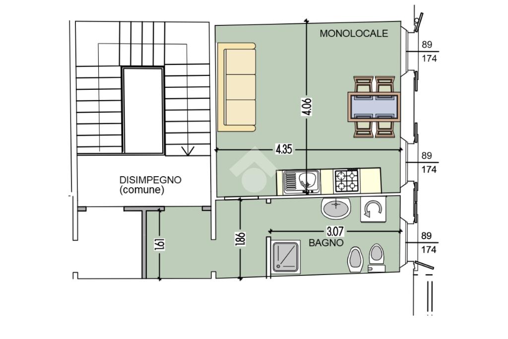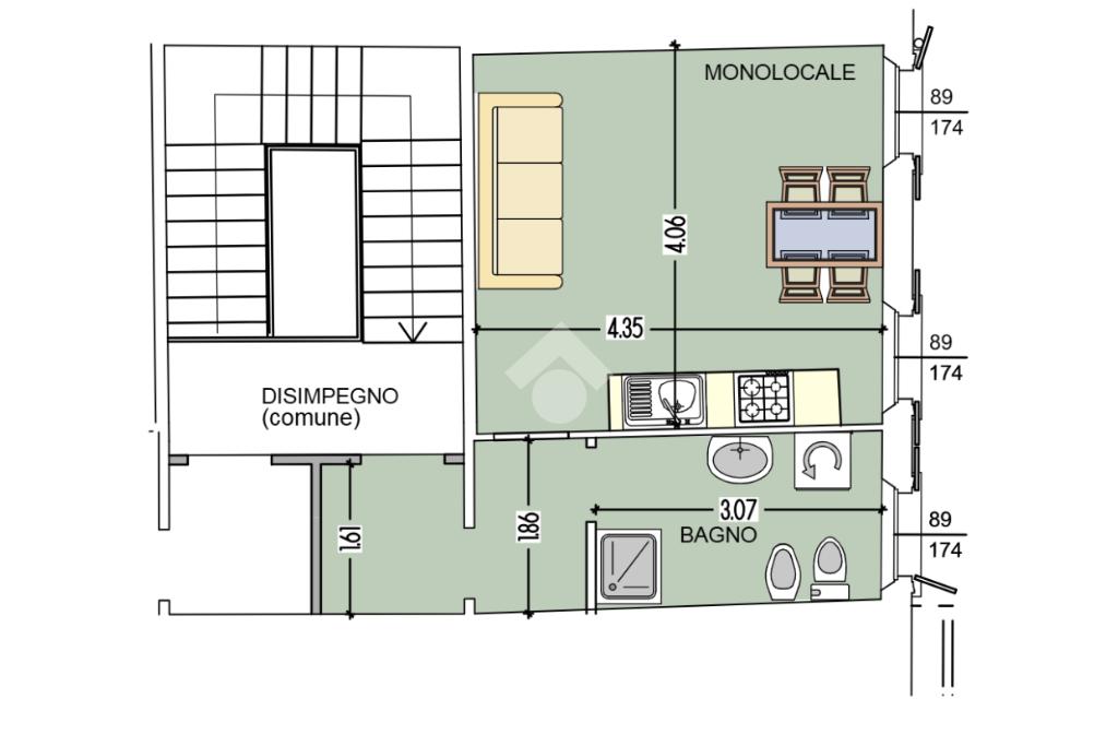 L'appartamento è composto da ingresso, disimpegno, ambiente principale living/zona notte, bagno con finestra.