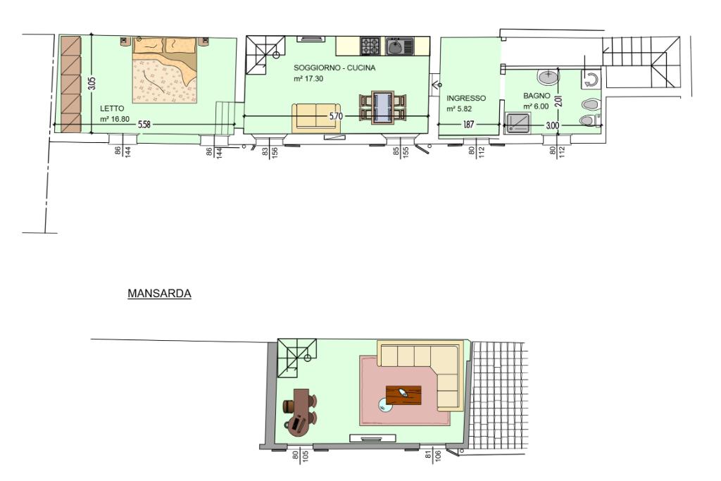 Salendo le scale interne troviamo ingresso, soggiorno con cucina a vista, 1grande camera matrimoniale, bagno con finestra ed un ulteriore ambiente con tetto a vista al piano superiore raggiungibile da una scala nel soggiorno