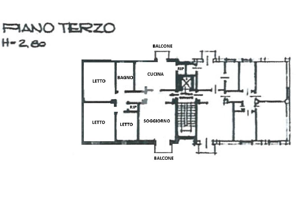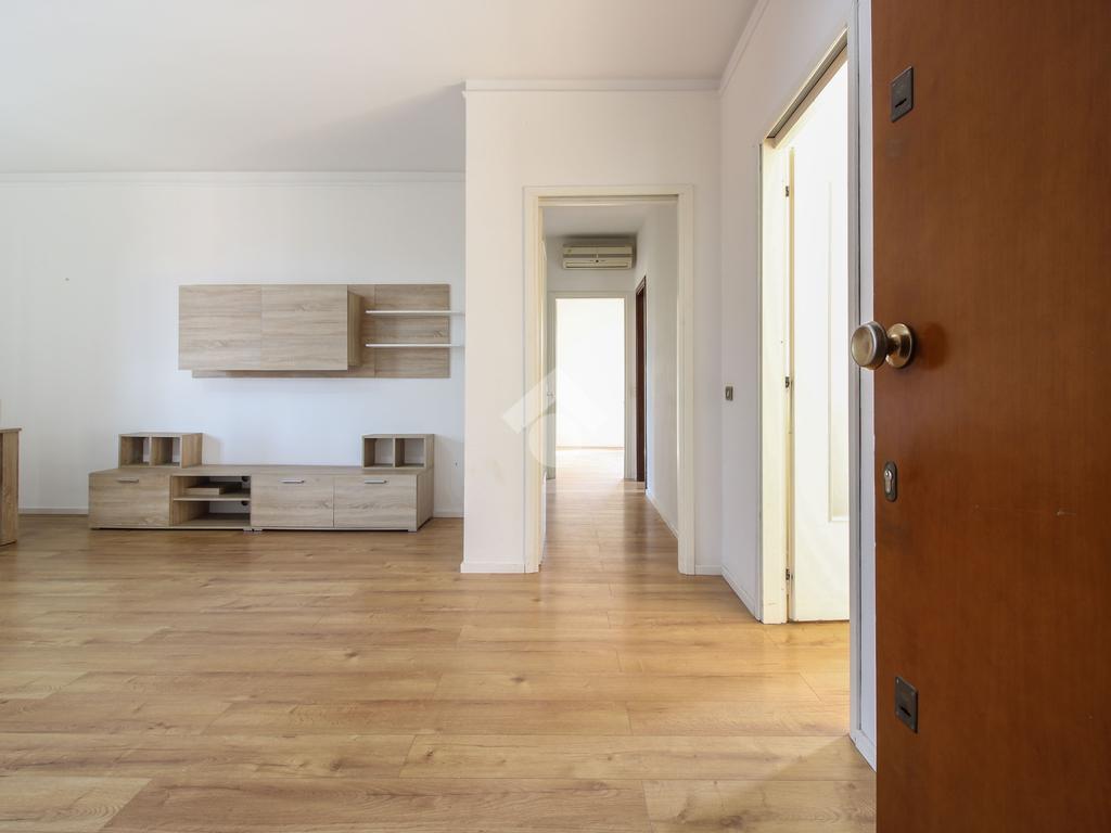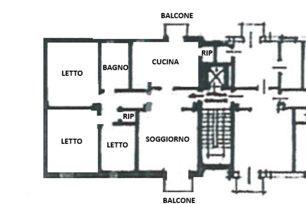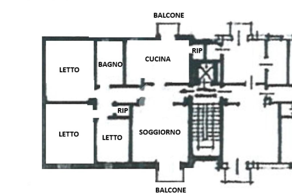 Ingresso su soggiorno con balcone, cucina abitabile con ripostiglio/dispensa e altro balcone, due camere da letto matrimoniali, una camera singola, rispostiglio e bagno.