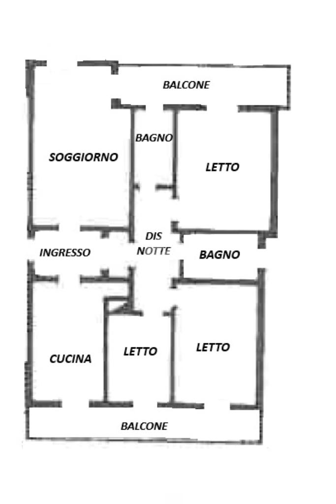 L'appartamento offre spazi generosi e ben distribuiti. Dall'ingresso si accede a un ampio soggiorno con balcone. La cucina abitabile dispone di un secondo balcone. La zona notte comprende due camere matrimoniali e una camera singola, servite da due bagni. Completa gli spazi interni un comodo ripostiglio.