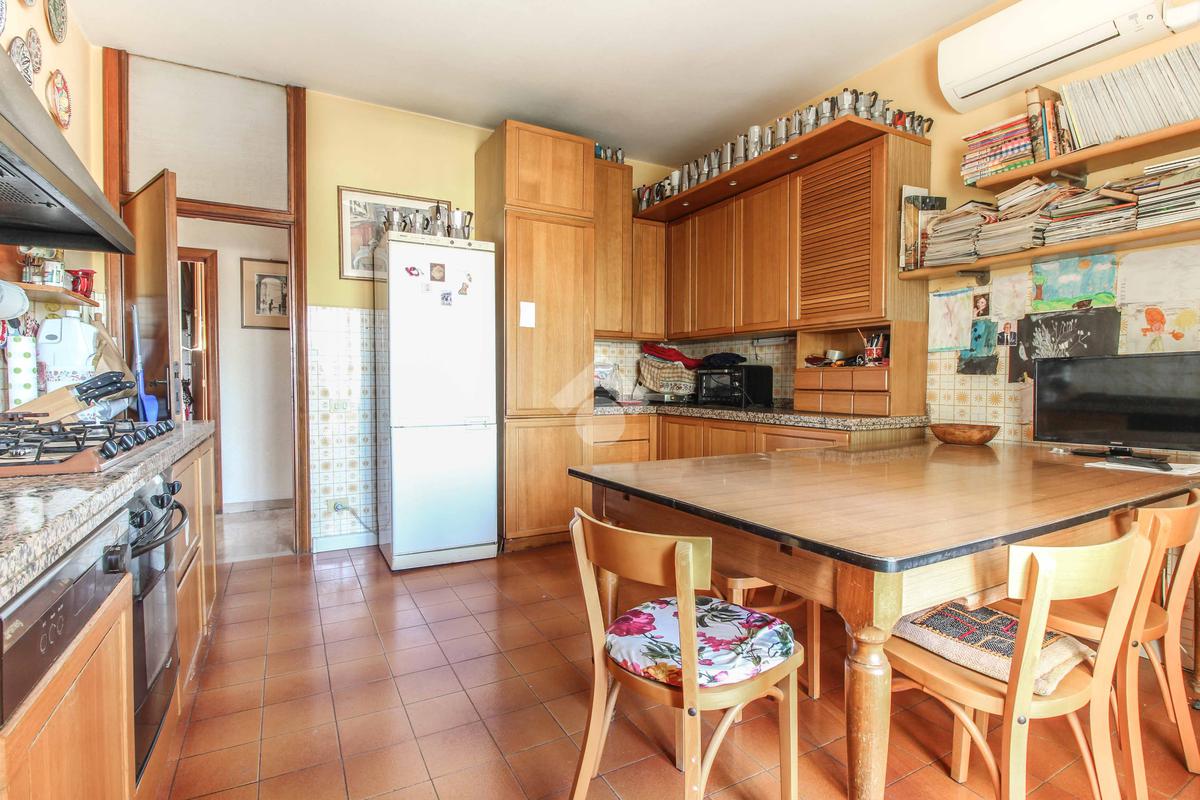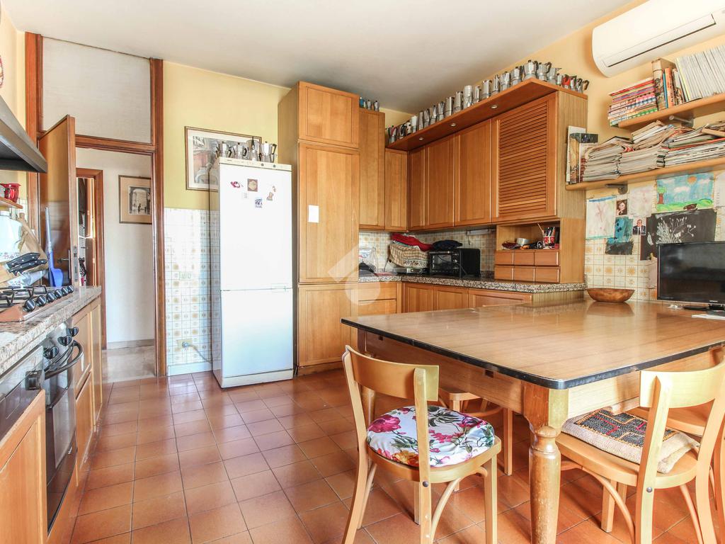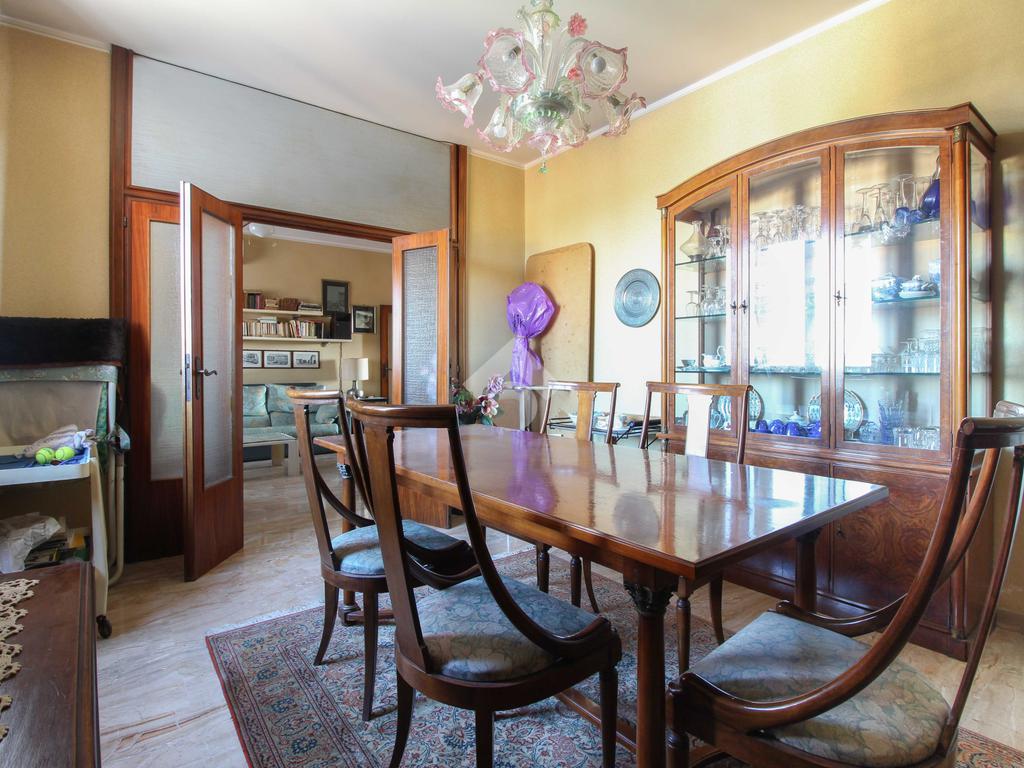 L'immobile offre una spaziosa cucina abitabile con balcone, doppio salone, studio con balcone, sei camere da letto (tre matrimoniali), due bagni e doppio garage al piano interrato. I bagni sono stati rinnovati negli anni 2000 ed è presente l'aria condizionata.